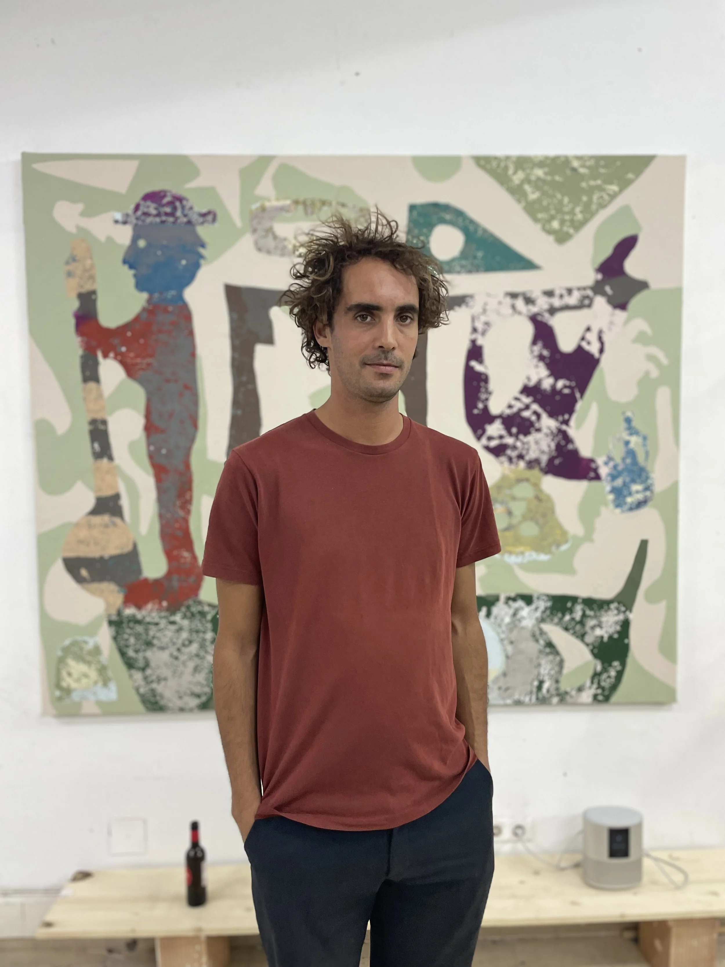 We visit Thomas during his Open Studios event in Palma to walk among his latest works—abstract yet human-like transfers of paint on canvas, leaning casually against the walls. He shares the space with fellow painter Nieves Guri and his partner, Marion de Racourt, who is a sculptor herself.